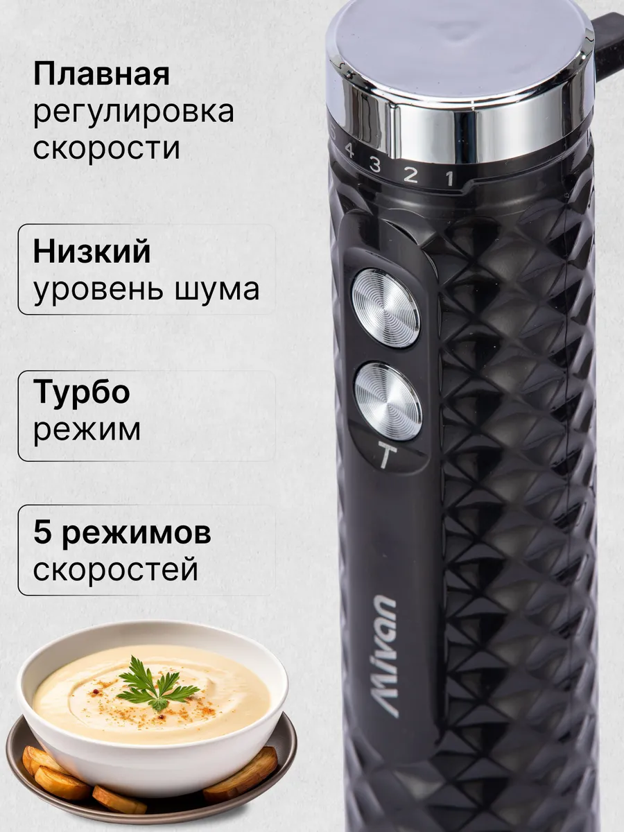- Доп. опции Режим «Турбо», плавная регулировка скорости, защита от перегрева, возможность мытья насадок в посудомоечной машине