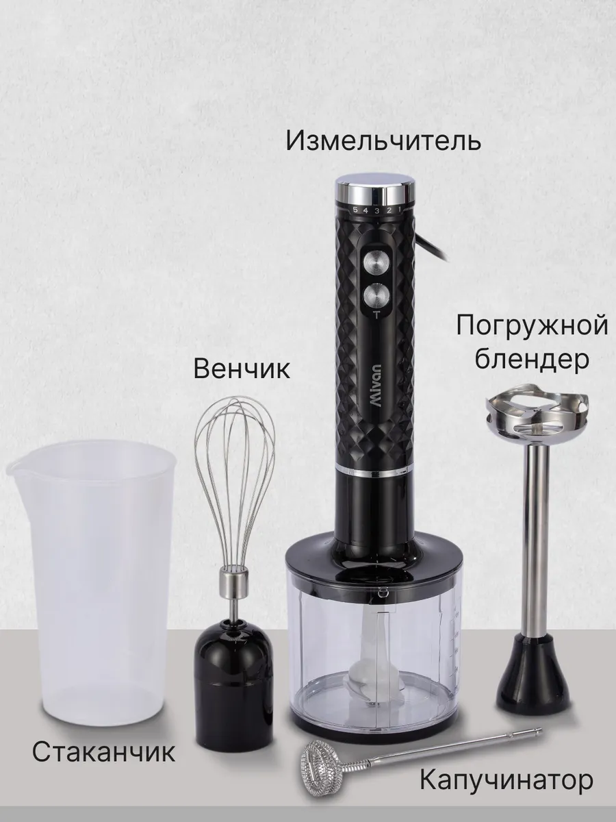 - Комплектация Погружной блендер, измельчитель, мерный стакан, венчик, насадки (капучинатор/прочие), чаша, инструкция