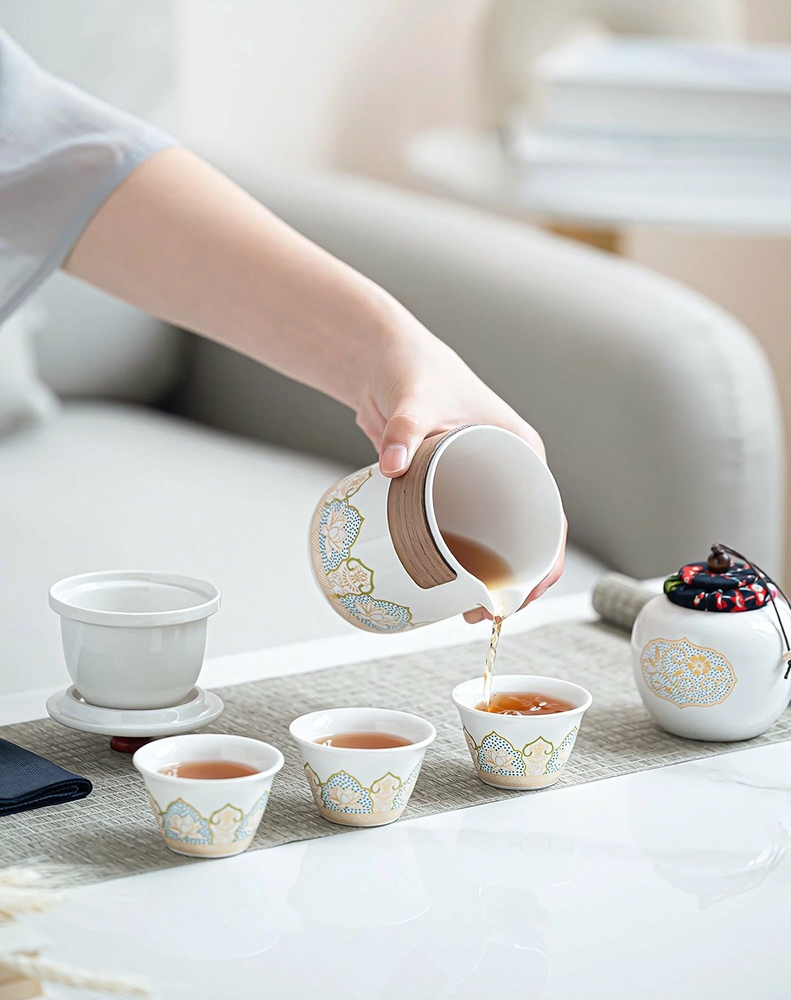 Посуда выполнена из прочной качественной керамики, которая хорошо сохраняет тепло и не впитывает запахи, благодаря чему чай раскрывает свой вкус максимально полно. Узор на каждом предмете придаёт сервизу особый шарм и подчёркивает эстетичность чайной церемонии. Чайный столик‑чабань облегчает работу чайного мастера: он собирает лишнюю воду и помогает поддерживать порядок на столе, а аккуратная подарочная упаковка делает набор готовым к вручению без дополнительного оформления.