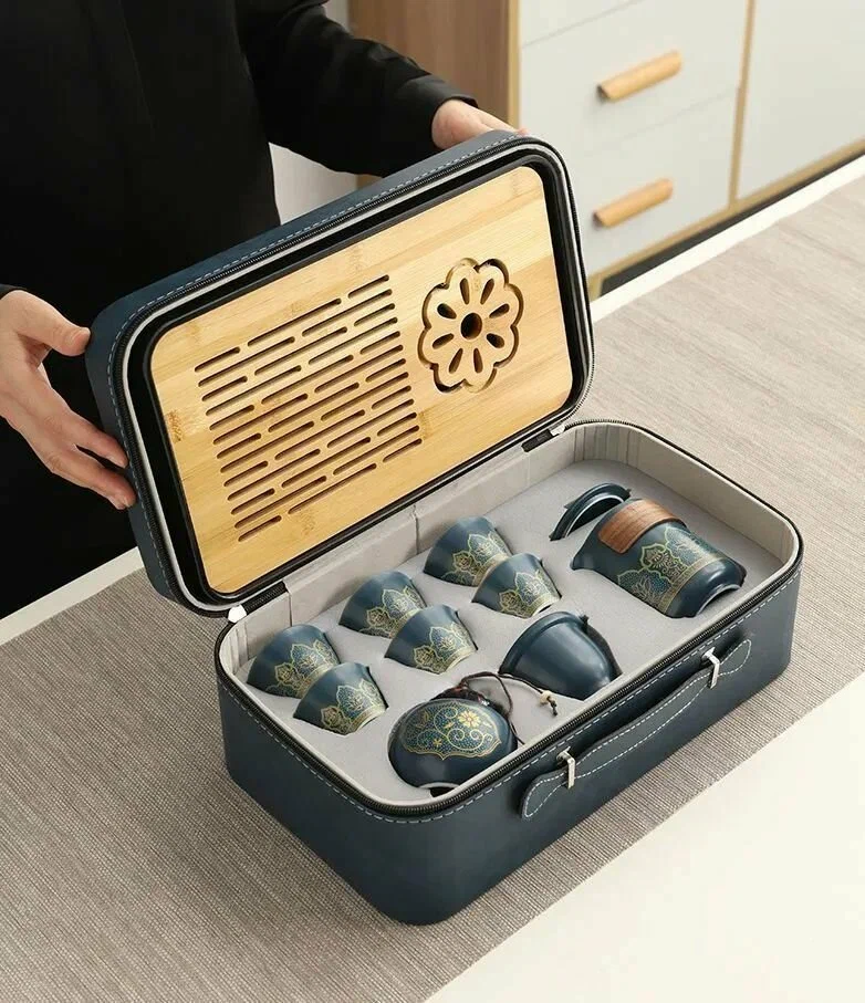 В составе набора шесть чашек‑пиал, заварочный чайник‑чахай с ситом, чайный столик (чабань/чапань), а также баночка для хранения чая. Такой набор позволяет проводить полноценную чайную церемонию: заваривать напиток, равномерно разливать его по пиалам и аккуратно размещать посуду на специальном поддоне. Компактный кейс с ручкой делает сервиз удобным для транспортировки — его можно брать с собой на дачу, в гости или на природу.